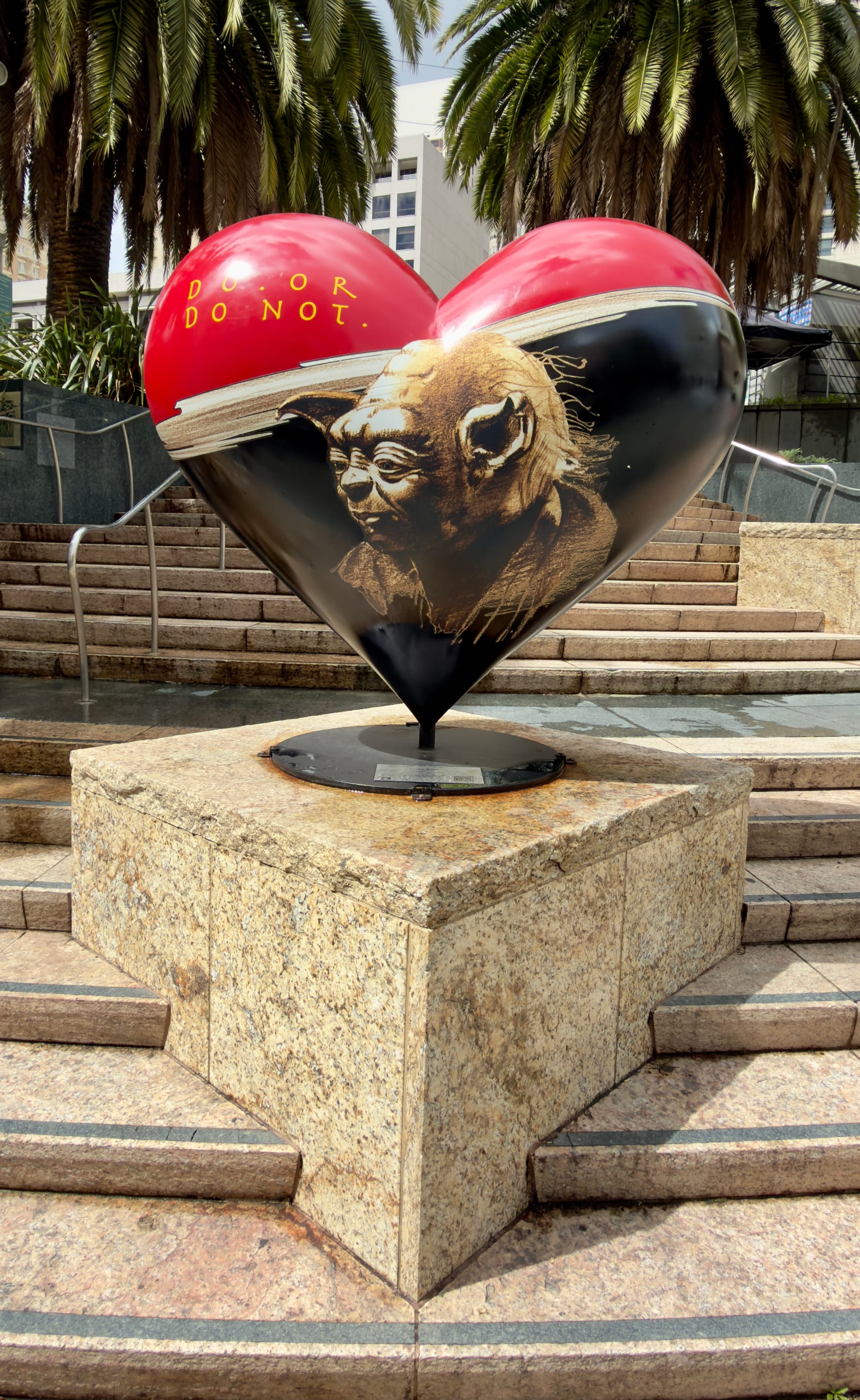 A coffee and a bit of cake revived me and we set off for the next phase of having fun. The key to the toilet in the coffee shop was tethered to a pasta spoon. We crossed Union Square to board the cable car north back the way we came. Along the way you can see the random Yoda on a Heart thing. With “Do do or not,” as an inspirational quote. Random.