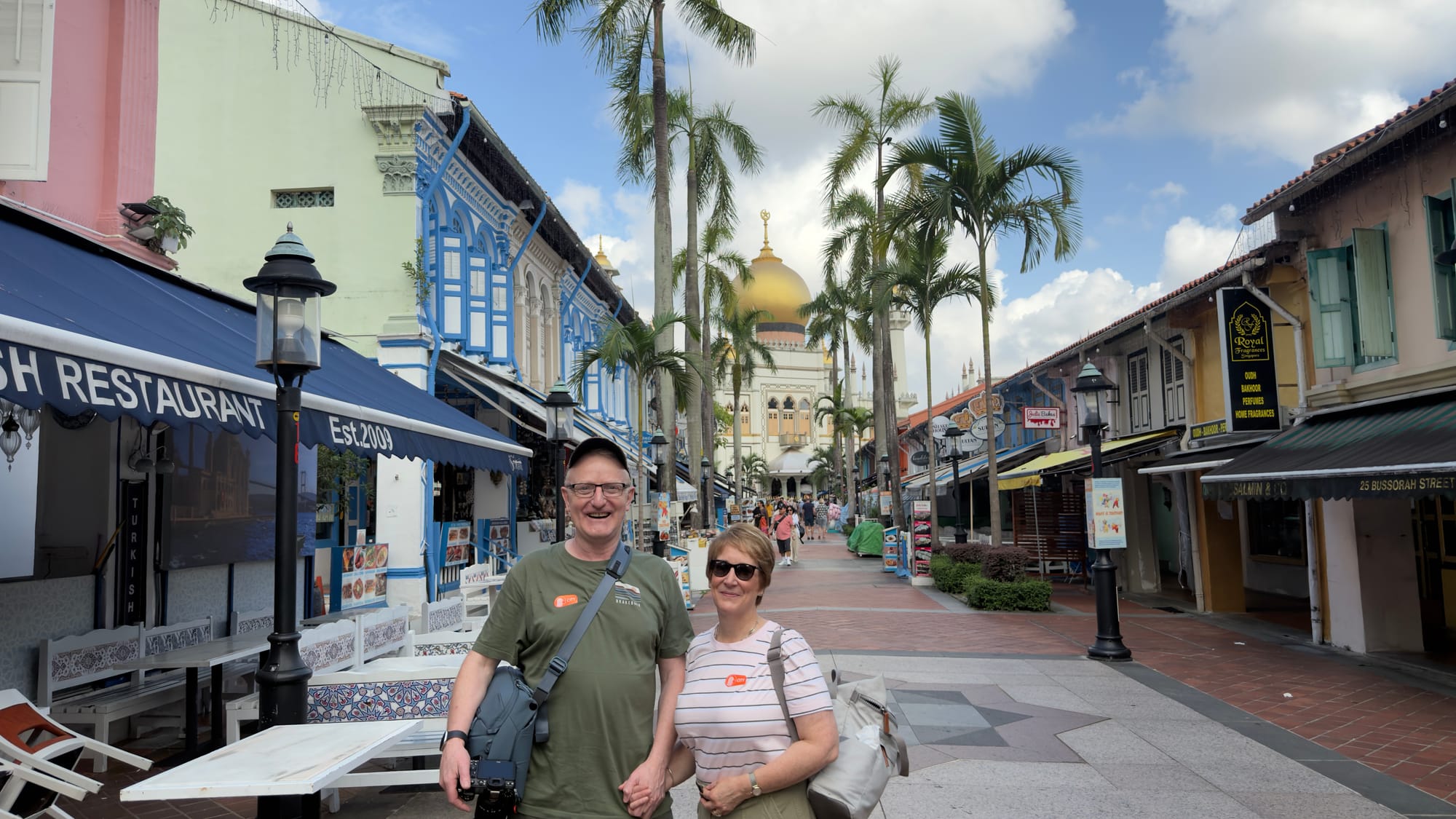 I must say that the tour was very well paced and our guide was both deliberatlely and naturally funny and informative all at the same time. All the while gently informing us of the many laws that could quite easily send any of us to jail. Chewing gum, jaywalking, vaping, littering, divisive racism and so on. We were reasonably sure we were good for avoiding significant jail time. Anyway as luck would have it the first stop was a Mosque in Kampong Glam. Lovely place with a rich history. Suffice it to say we made friends with a few folks and thus gained the couples photo.