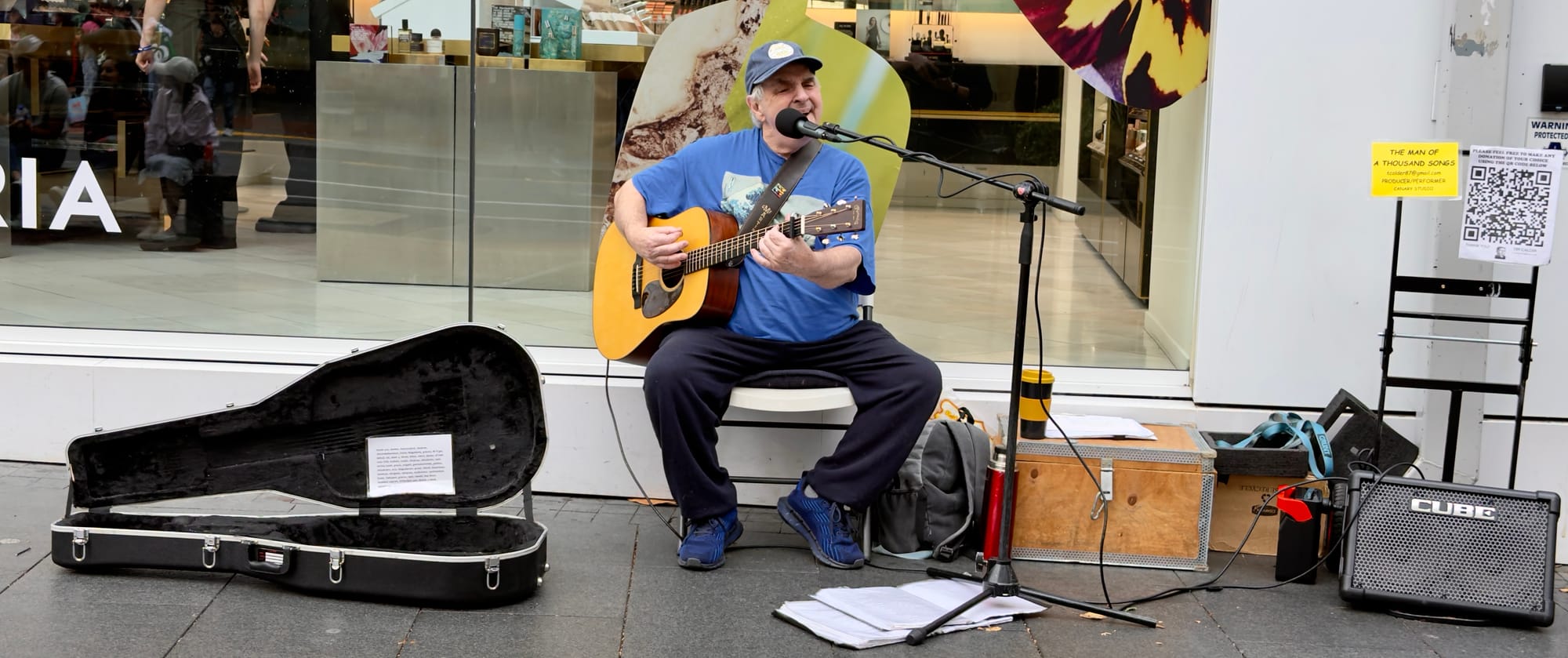 We headed up Queen Street past Dior, Prada and Louis Vuitton. Mrs Verno went into Mecca to peruse the wares there. I stayed out because death would be preferable and listened to an elderly busker. Gave him $2, then took his picture. That’s the way it works. Well, while tootling about I heard a shout and a youth ran past me. Looking back I saw the busker looking forlorn. It seems that just like the start of the film Once ( a great film and to be recommended) the little wagpastie had helped himself to the busker’s hard earned coin. Little bastard. I felt invested because I had just out $2 in his guitar case but I stayed out of it. I did keep a look out for the wee decker as we proceeded up the street. Lucky for him we didn’t see him.