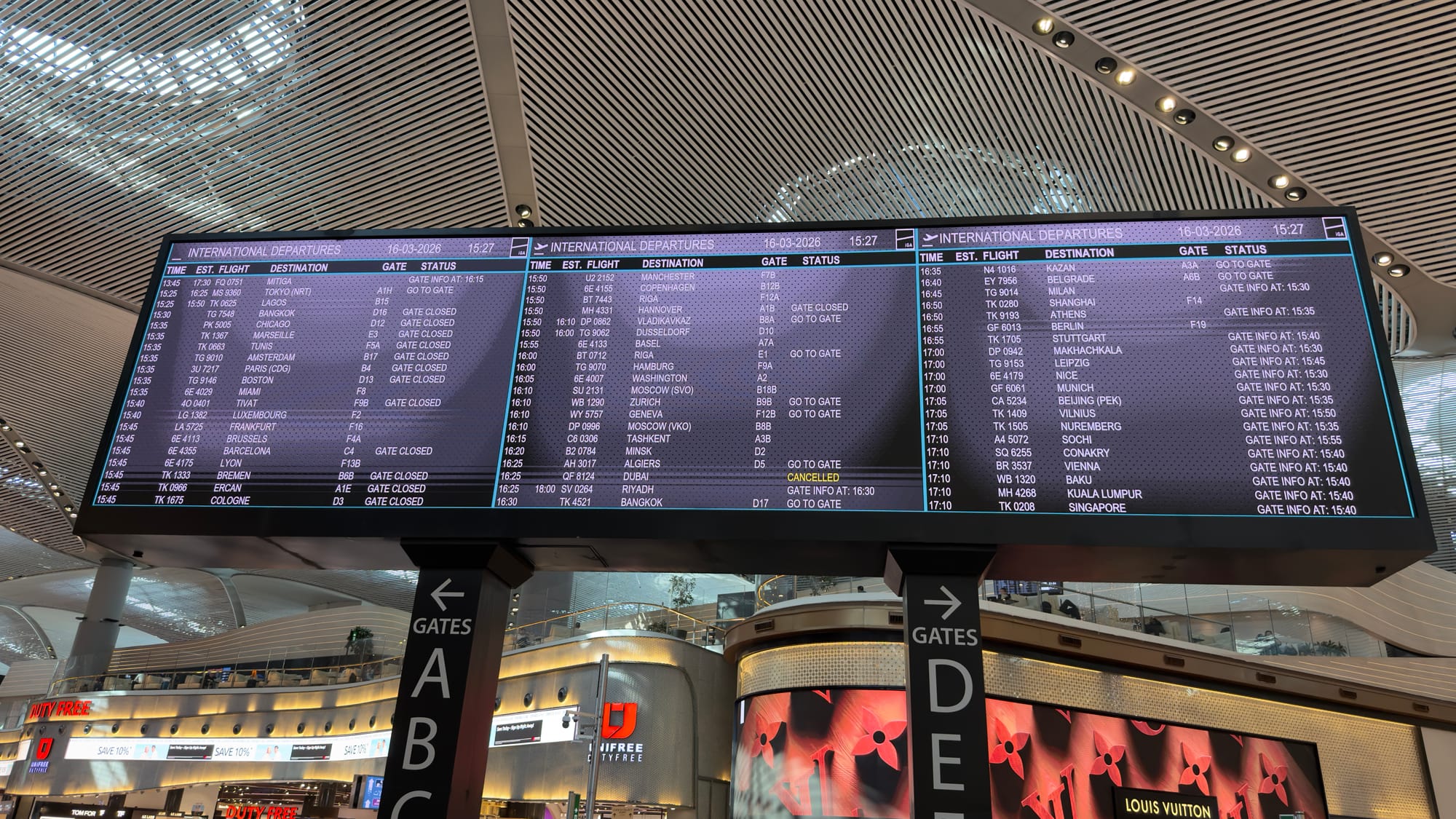 The Blue Mosque was spectacular as you can see. After that we waited for our lift to the airport. What an airport. The size was quite unbelievable. Even the notice boards were impressive.
