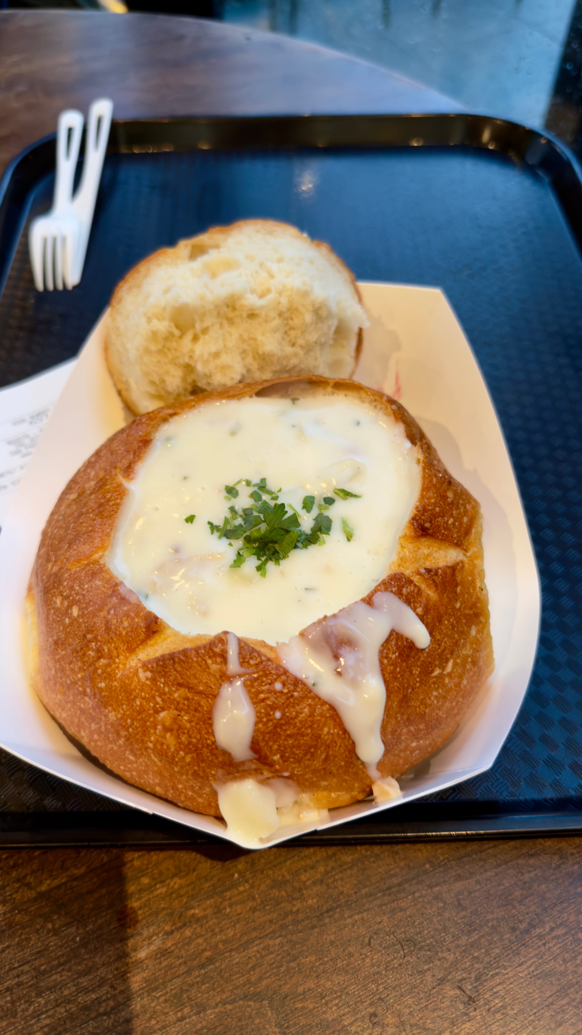 The rain came on and I returned to a rejuvenated Mrs Verno who had turned the room into a veritable sauna what her pre-packing ironing routine. I was reacquainted once more with Betty Swallocks and not for the first time on this trip. Singapore needed special remedial action in the aftermath of that experience. We settled for a quiet time in which I managed to pre-clear us through Canadian immigration. This only made the next part more perplexing. Checking in proved frustrating as the Air Canada app (which obviously referred to CBSA, and having seen the TV show you all know) refused to accept that we had valid visas. Holy good god. Between Rory and this the day was not going as planned. We tried and tried. To no avail. I have printouts of our acceptance and remember I have already travelled on mine. Well we headed on out for a quick tea, chowder in a sourdough bowl and a cheese and bacon toastie. Somewhat of a diet meal but tasty and sustaining. After eating we tried checking in again and lo and behold. Love that phrase. Yours truly was checked in. Seat 13B. Not a good sign but a sign nonetheless. Mrs Verno remained persona non grata if you will. I have promised not to leave her behind. Anyway, here’s a chowder sourdough bowl to cheer you up.
