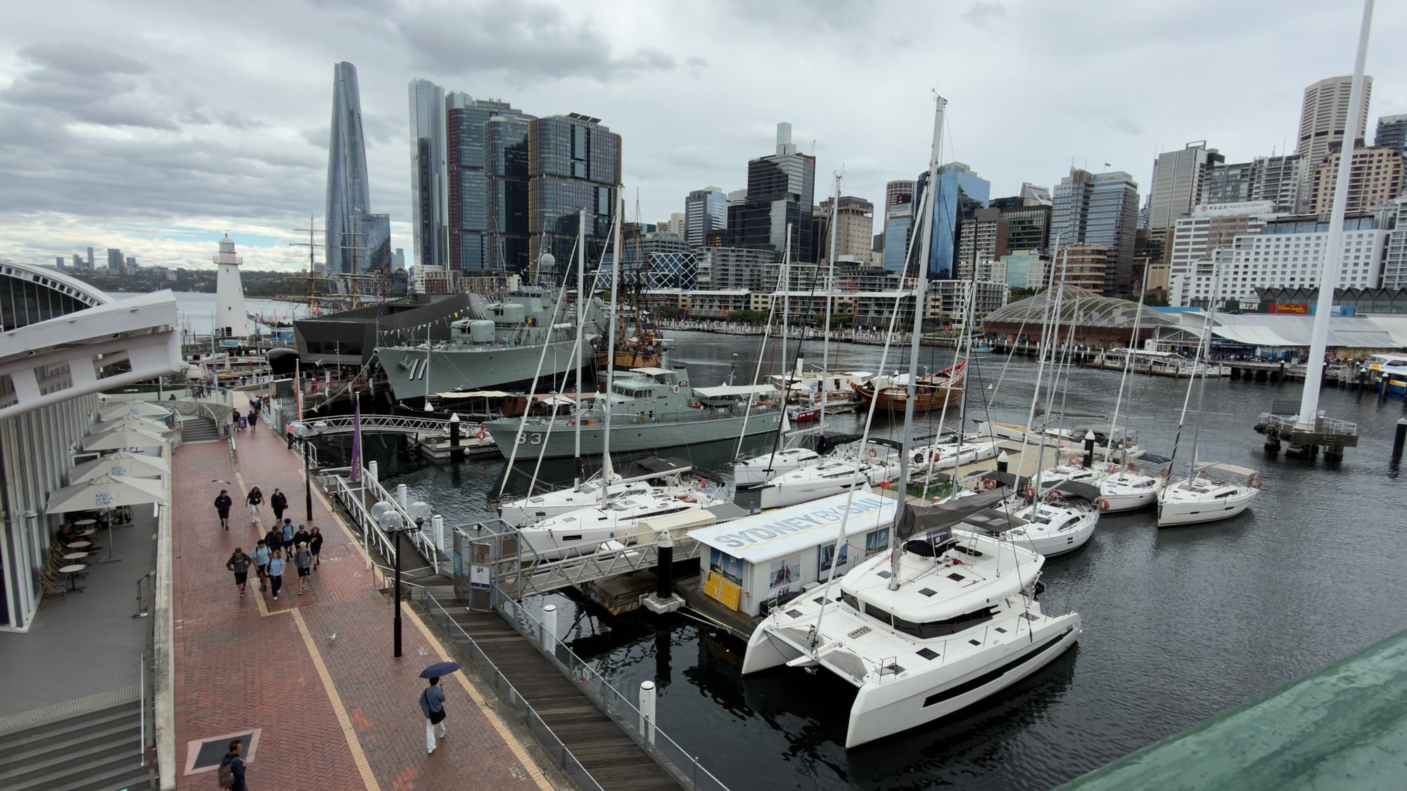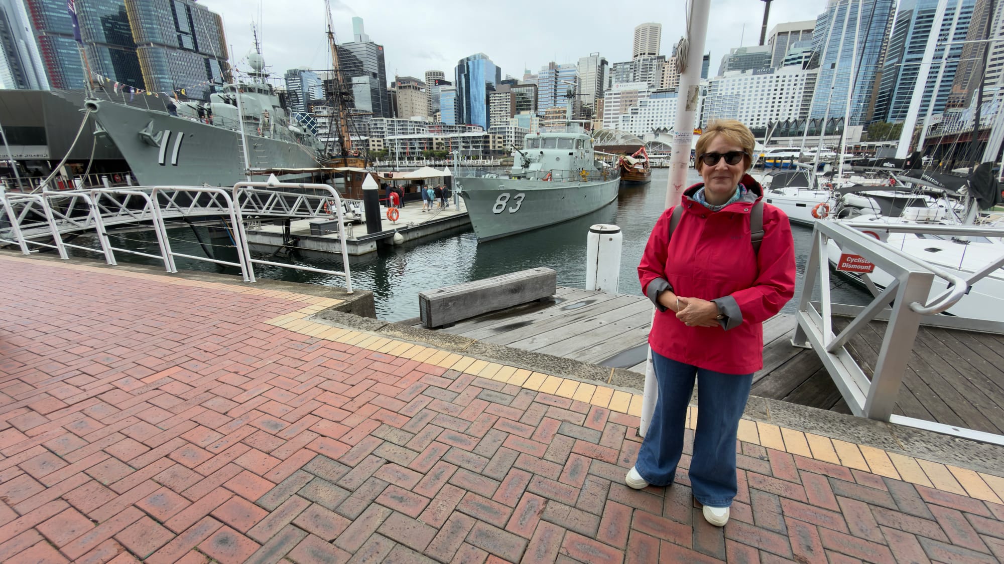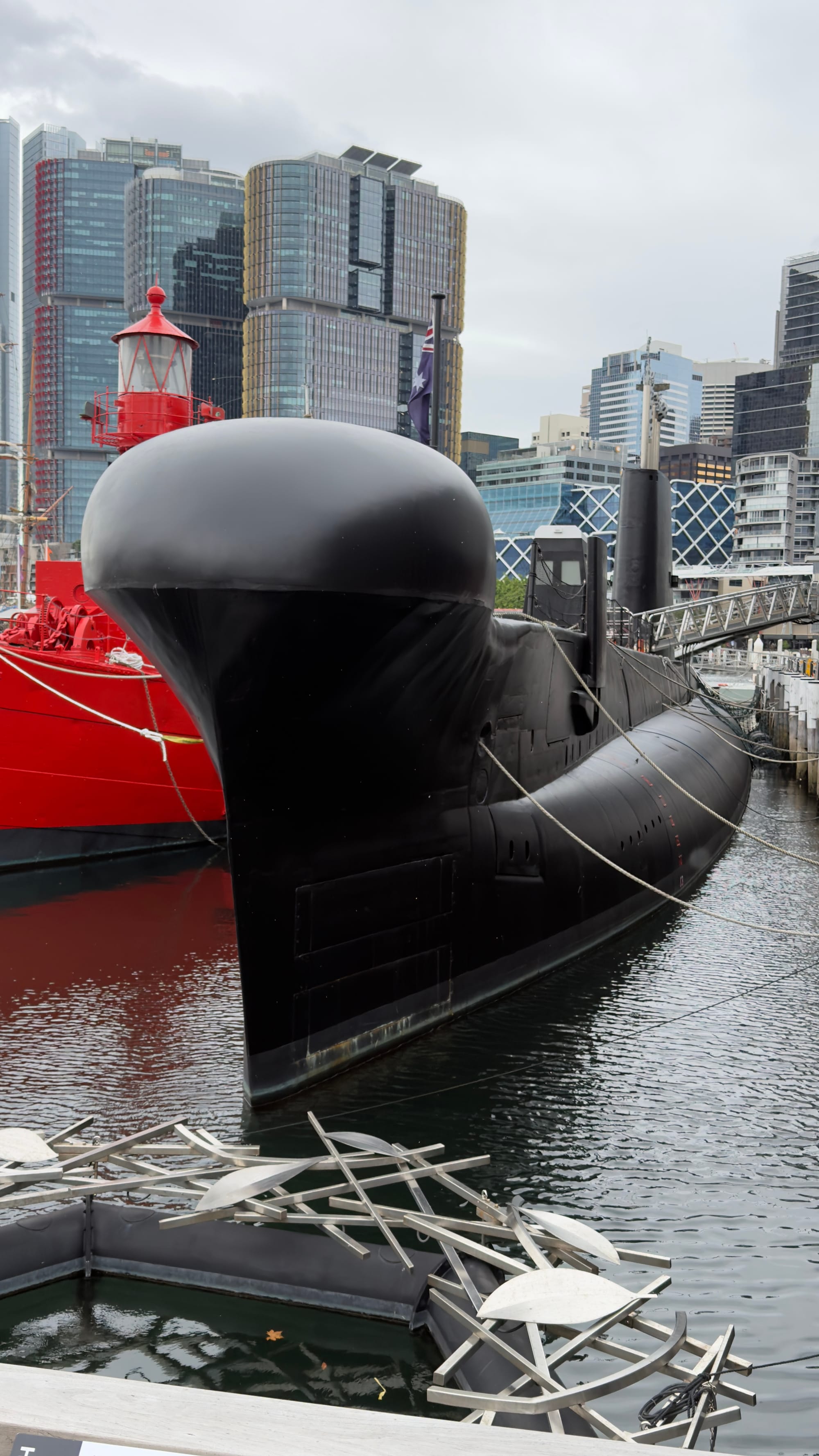 Suitably fortified we set of for Darling Harbour and having recced the route previously we chose to head up the left side towards the Maritime Museum. The rain was trying its best and the waterproof had to be donned as we took in the replica of Captain Cook’s ship The Endeavour and assorted other warships including a fecking huge big black submarine.
